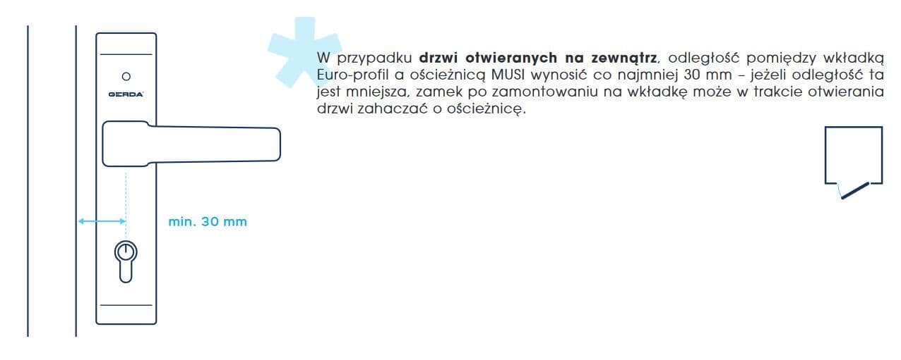 - Kompatybilność z drzwiami otwieranymi na zewnątrz (wymagana odległość między osią wkładki a framugą: minimum 30 mm)